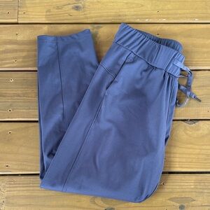 Lightweight gray joggers designed for active wear. Elastic drawstring waist for a secure, adjustable fit. Smooth, stretch fabric allows full range of motion. Tapered legs with practical side pockets for essentials. Versatile black style suitable for workouts and everyday wear. Photographing more blue in last photos but they are gray