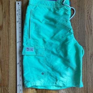 Men’s green swimsuit, size medium. Lined with pockets on each side and an additional cargo pocket. Velcro and tie waist. In good used condition, no rips, tears or stains. Please ask for additional measurements if needed.