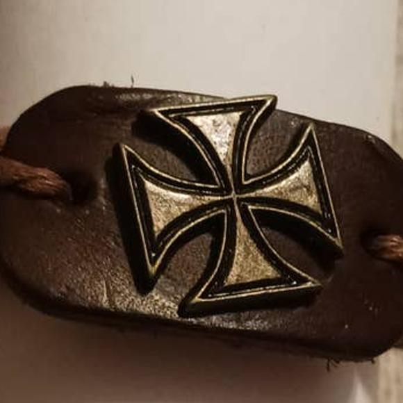 Men's iron cross brown leather bracelet with rope on the sides. It's adjustable, new without tags and comes from a smoke free home.