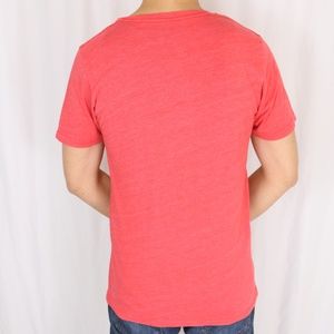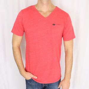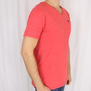 Used in good condition. Mens V-neck T-shirt. Small bleach stain white spot as shown in 5th picture. Item is still a great wear and works great.