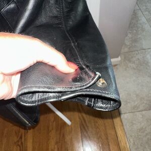 Upgrade your wardrobe with this sleek black men’s leather jacket. Designed for style and comfort. Inside pockets, lightly lined. Small blemish on right shoulder- otherwise in perfect condition!