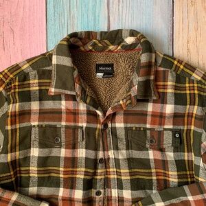Mens marmot fleece lined long sleeve flannel size xl. In pre owned condition, no rips or stains. Super warm every day fleece lined flannel. No stretch.