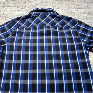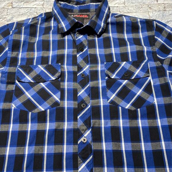 Men's medium Tony Hawk button up shirt. Blue, black and gray. To the right of the right pocket there is a Clorox spot, not noticeable on but it is there. Smoke free home.