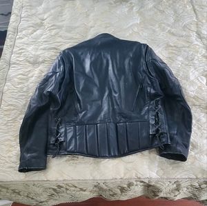 pre-owned men's motorcycle jacket. this is a heavy duty jacket. spent $300 on it. listing it as an XL. I'm 6'1 235 lbs and fits perfectly. could fit XXL. few spots on the back where they leather I guess has come off. not noticeable from a distance.
