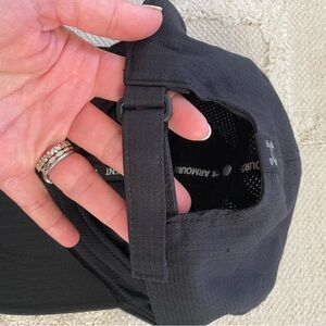 Never worn but no tags. Lightweight men’s performance baseball cap. Black with white label. Adjustable strap on back.