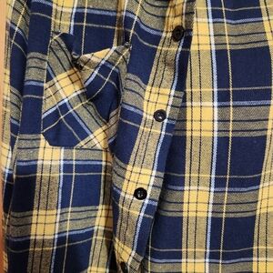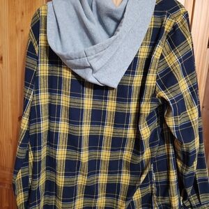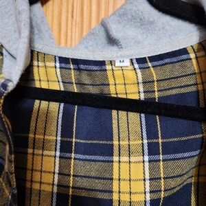 mens light weight plaid button down hoodie yellow and navy missing hoodie string