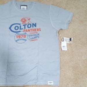 Brand new with tags this is a rugged brand t-shirt crew neck short sleeve the color is gray super soft at 100% cotton and blue letters it says the Colton Panthers 1978 division champs and an orange has a picture of a panther the size is large from a smoke and pet-free home the measurements are approximate from armpit to armpit is about 23 in and a length is 29. Xl arm pit is 25 length 29 in and 2 xl is 27 in , length 30 in.