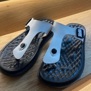 The men's ETLieren sandals or flip-flops in black are in like-new condition. These sandals are made from high-quality, handmade material that is both durable and non-slip. They come with arch support, buckle-adjustable leather straps, and an extra-padded, ultra-soft liner that provides a comfortable foot feel for walking all day. The sandals are size 46 or US size 10.5-11. Available in two colors,same size.