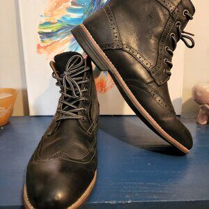 Men's size 12 black leather Oxford style lace up boots. Ankle height with black suede tongue. Brown leather and fabric interior and in soles. Black rubber out sole with raised heel.