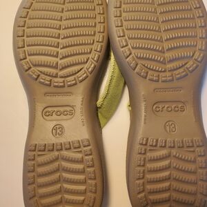 Tan Croc brand flip flops. Green fabric strap. New without tags. Never worn.