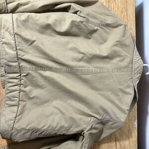 Men’s size large fleece lined. It’s about 32” long by 22” wide. Does have small hole on rear of jacket in the lower portion as shown , about the size of a dime . Smoke and pet free home. There is a stain on each arm that I’m not able to get out , as shown with arrows.