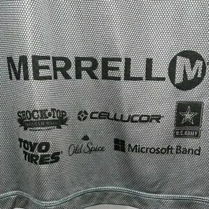 Description: Merrell Half Finisher Tough Mudder Dri-Fit short sleeve shirt with all of the sponsees on the back tail of the short.