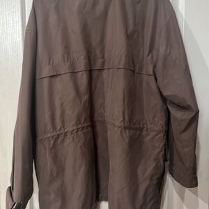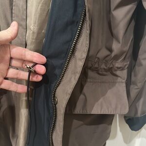 Weather resistant has buttons and zipper and also has the pull tight string to give you a drawstring waist has top pocket side pockets in the front has several pockets on the interior