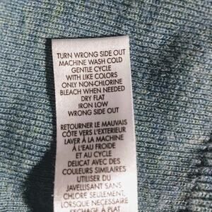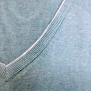 Pictures don’t show the color well. Beautiful light bluish-gray color. The neck has thin white trim. Great looking sweater. Great preowned condition. XL