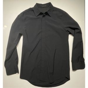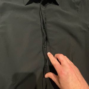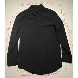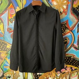 This men’s theory button down dress shirt in size small is super chic, and very fashionable for any occasion and of course theory is classic and timeless yet modern. The buttons in the front are covered by another overlay of fabric to give the finished sleek look that you see in the pictures. Definitely sure to get many compliments with his shirt!