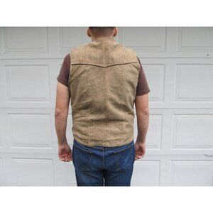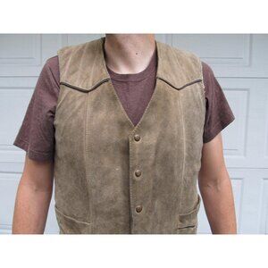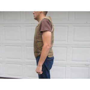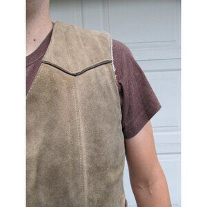 This is a vintage men's suede vest made of thick light brown suede, with sherpa wool lining. The vest has snap buttons on the front, and leather piping detail. Vest has some staining, as shown in the photos. Fit is like a modern M or L.