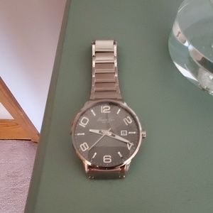 Grey face, silver links, date integrated to watch face, extra links and box included. Watch does need a new battery