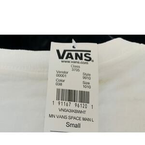 You are purchasing a great looking white long sleeve t-shirt by VANS. This shirt is size S classic fit, according to the interior tag. The chest measures 18 1/2 inches, the length is 26 inches and the sleeve length is 22 inches. The shirt is part of VANS NASA collaboration celebrating the lunar landing. The t shirt has the NASA logo on the chest. There is a Vans tag on the front of the shirt near the hem. The back of the shirt has a space themed interpretation of da Vinci's Man sketch the Vitruvian astronaut. The shirt is 100% cotton and is new with tags.