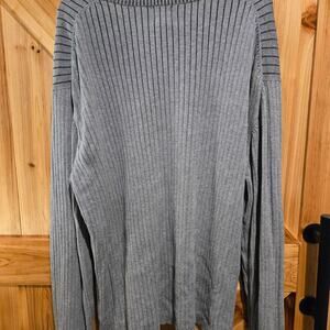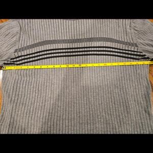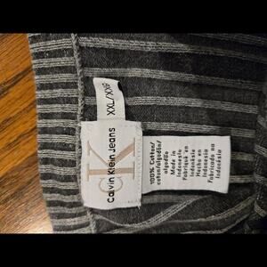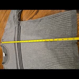 men's grey stripped Calvin Klein sweater. measurements arm pit to arm pit 23 in, length 28 1/2 in, shoulder to shoulder 22 in, sleeve length 26 in.