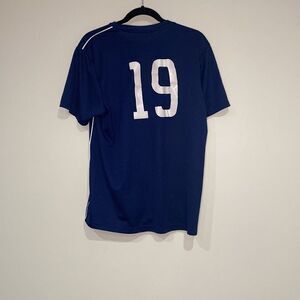 Gently worn navy blue and white Jersey. Some loose threads and minor wear along the text. Comes from smoke free home