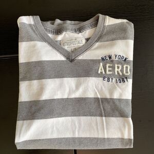Mens Aēropostale V-Neck short sleeve Gray & White Stripe T-shirt. Embroidered NEW YORK AERO EST 1987 on left chest. Size large. EUC