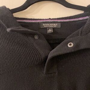 Gently worn men’s Banana Republic black merino wool hooded sweater. Has a minor tear at the front as pictured but otherwise in great condition. Comes from smoke free home.