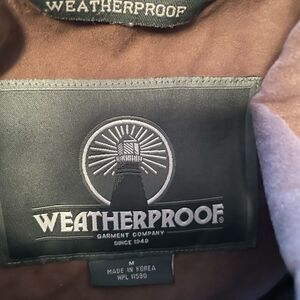 Very nice men's Weatherproof jacket! Brown microfiber fabric that is machine washable! Front zip closure with buttons on at waist, collar and wrists. Double pockets outside, one zippers up. Also another zip closure pocket inside. Size Large.