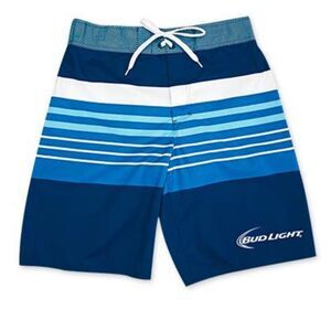These trunks come in blue with white stripes and the traditional "Bud Light" on one side. Officially licensed. Unlined. 100% polyester. Drawstring front elastic in the back.
