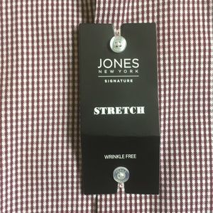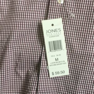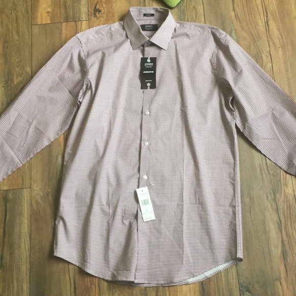 White Grnd, Burgundy Checkered. Stretch, Wrinkle Free. Size Medium 15 1/2. New with tags. Never Worn.