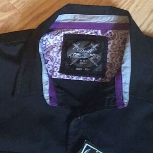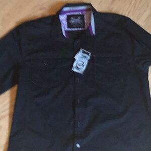Beautiful men’s black DRILL shirt, NWT. Trim is very dark purple. Size extra large, button front, button down cuff, cuff rolls up to button also. 2 front button pockets. Gorgeous shirt! Measurements are as follows: neck 17”, heat 44”, sleeve length 27”, shirt length 29”.
