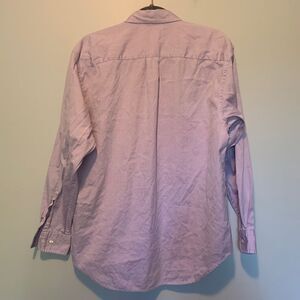 Men’s button down Oxford. Light purple with white buttons. Small white stain near right wrist buttons.