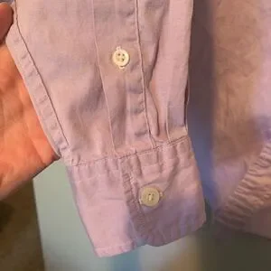 Men’s button down Oxford. Light purple with white buttons. Small white stain near right wrist buttons.