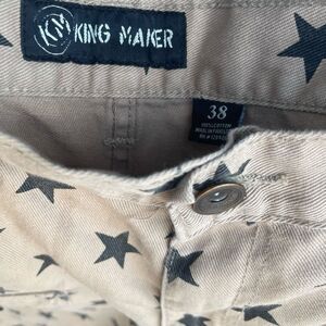 Men’s King Maker Tan Denim with Black Stars Casual Shorts. Size 38. )Have Matching Vest For Sale). These shorts are missing a button on the rear pocket. Otherwise I’m good condition.