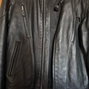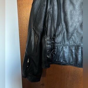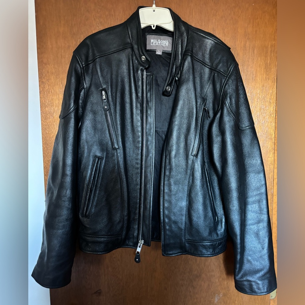 Men’s leather riding jacket by Wilson’s Leather. Size Large. In excellent condition. Zip up front with snap collar closure. Zip on bottom of sleeves. Two lower pockets on front and the zippers on upper chest are for wind vent. Inside has one pocket. Sleeve has extra leather patch on elbows.