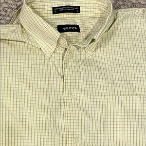 Men’s Nautica short sleeve button down shirt. Size L. Neck 16. Yellow w/ blue stripes. Pit to pit approximately 24”. Excellent condition from a smoke free/ pet friendly home. I ship immediately.