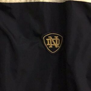 Adidas waterproof light windbreaker. Navy blue and white. Notre Dame Insignia on front. Excellent preowned condition. Pit to pit aprox.23 length 28 in.