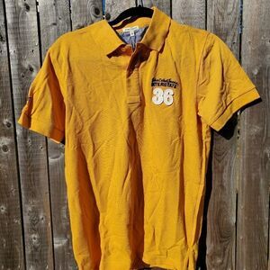 Yellow John Cabot Polo. Shirt sleeve, 2 button in front. John Cabot Jeans with an American Flag stitched on one arm. John Cabot Jeans Interstate 36 stitched on front chest.