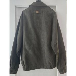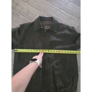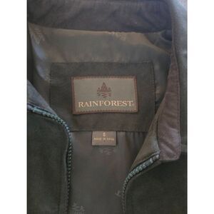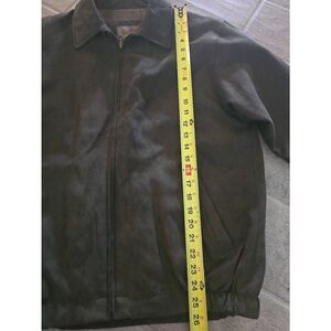 Mens Rainforest Faux Suede Jacket. Bomber Style. Full zip. Has outside pockets, and two inside pockets. Dark Olive Green. Excellent condition. Size Small, approximate measurements in photos.