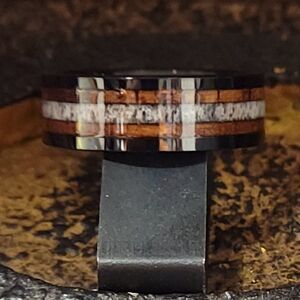 The outer band has deer bone inlaid down the center flanked by whiskey barrel inlays on each side.