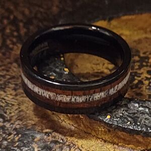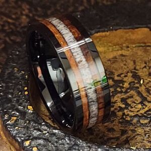 Men's Real Black Tungsten Wedding Ring Deer Bone and Whiskey Barrel Wood Inlay