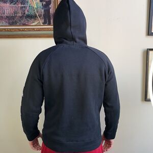 Black, pullover hoodie with kangaroo pocket and tie around the neck. There is some pilling throughout the fabric. Approximate measurements shown in photos. Overall good worn condition.