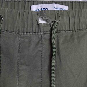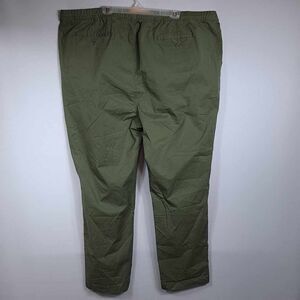 Deep green size xxxl. Pullon style with 2 front pockets, and 2 rear welt pockets. Elasticized waistband with drawstring. * Front is damaged at drawstring, can easily be repaired, see pictures. Fabric is 97% cotton, 3% spandex. Measures 48" waist, inseam is 30".