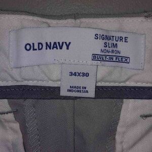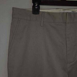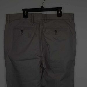 Light gray, size 34. Classic 5pocket style with straight legs and zipper fly front with button, plus inside button. Non iron, built in flex fabric. 98% cotton, 2% spandex. Measures 34" waist, inseam is 30".