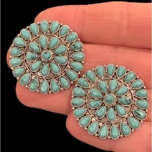 TAGS: Navajo-style earrings, Zuni-style jewelry, concho earrings, western statement studs, cowboy fashion, rodeo style, Santa Fe style, turquoise cluster earrings, desert chic jewelry, rustic western fashion, frontier-style studs
