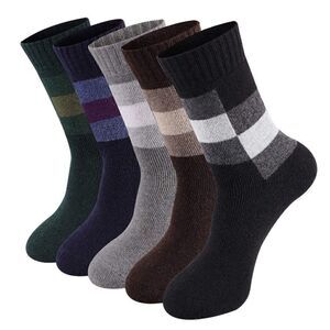 Perfect for the winter weather! 5-pairs of socks that are a blend of 61.2% Polyester, 31.6% Wool, 5.1% Cotton, 2.1% Spandex.