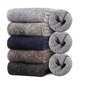 Perfect for the winter weather! 5-pairs of socks that are a blend of 61.2% Polyester, 31.6% Wool, 5.1% Cotton, 2.1% Spandex.