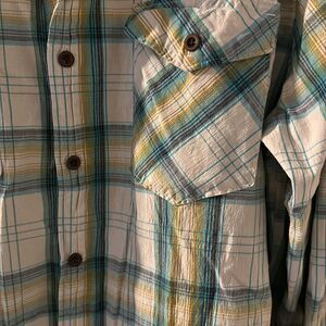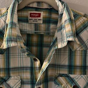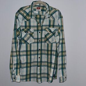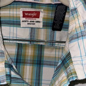 Men’s Wrangler Long Sleeve Shirt Plaid Aqua blue and yellow Large Excellent Condition