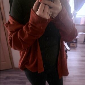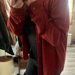 Can be worn as an oversized women’s shacket or regular fit men button up lightweight jacket/sweater size L rust red EUC only tried on and worn over shirt once