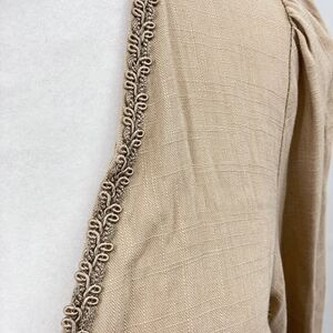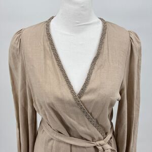 Menti Neutral Linen Blend Wrap Dress sz S Made in Greece Balloon Sleeves Ruffles