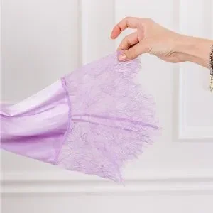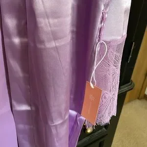 Mentionables Silk Robe. Brand new, excellent condition. It’s been kept in the package and was just taken out for pictures. Has lace draining on the sleeves and on the bottom. Lilac color. Size XL.